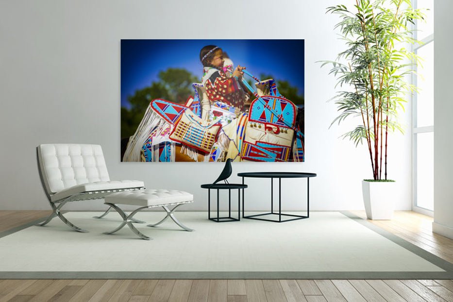 Explore the rich heritage and skilled artistry in Michael W. Rutherford’s captivating photograph, "Ride of the Papoose". This powerful image showcases a young Native American girl on horseback, embodying the profound bond between Native American tribes and their revered horses. The girl's attire, with intricate beadwork and regalia, reflects cultural pride and generational craftsmanship, making this piece a beautiful tribute to Native American heritage.