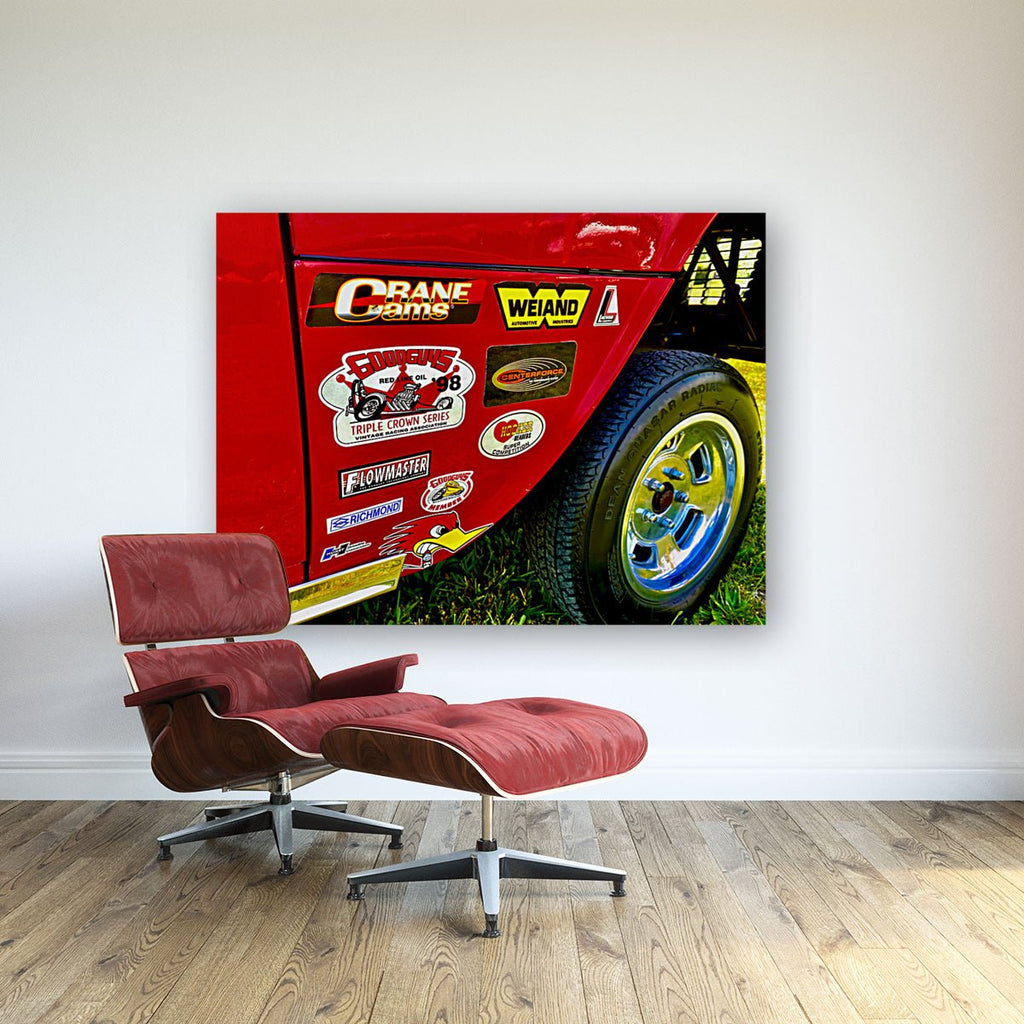 Immerse yourself in the high-octane world of motorsport culture with our Vintage Motorsport Sticker Collage Print by Michael W. Rutherford. This stunning print features a vibrant red vehicle surface adorned with authentic racing stickers from legendary brands like Crane Cams, Weiand, and Flowmaster.