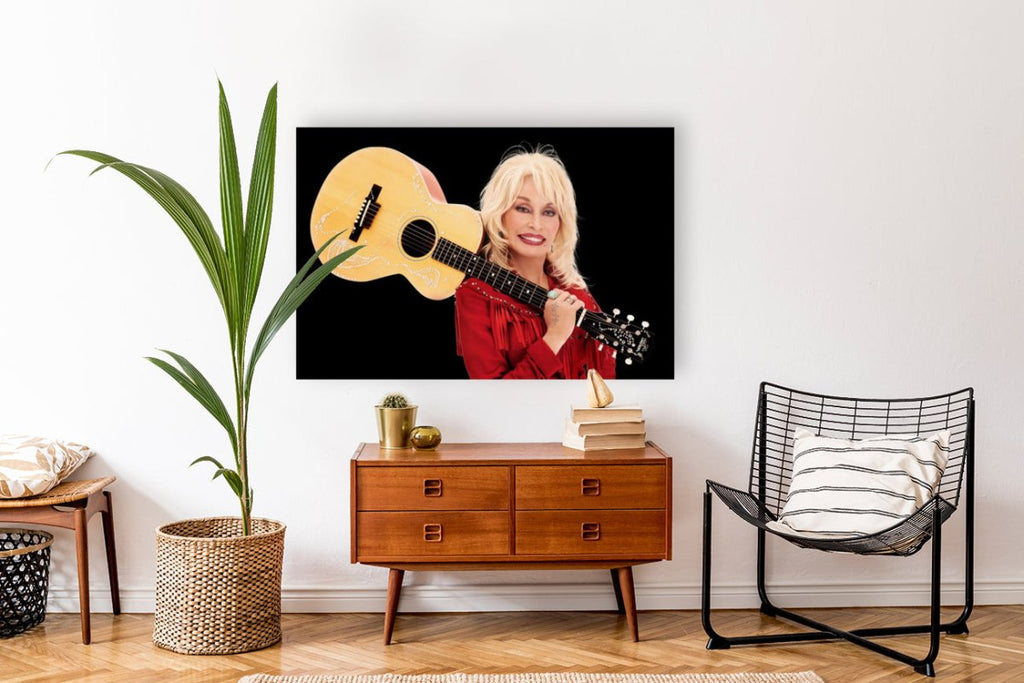 - Subject: Country music icon Dolly Parton with her signature acoustic guitar