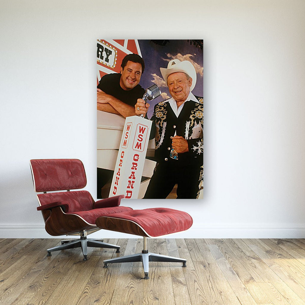 Capture the essence of country music history with this timeless vintage western cowboy art featuring legendary artists Vince Gill and Little Jimmy Dickens, photographed by Michael W. Rutherford. Set against the iconic backdrop of the Grand Ole Opry, this image celebrates the legacy of these country music icons as they stand behind the classic silver microphone, marked by the WSM Grand Ole Opry logo.