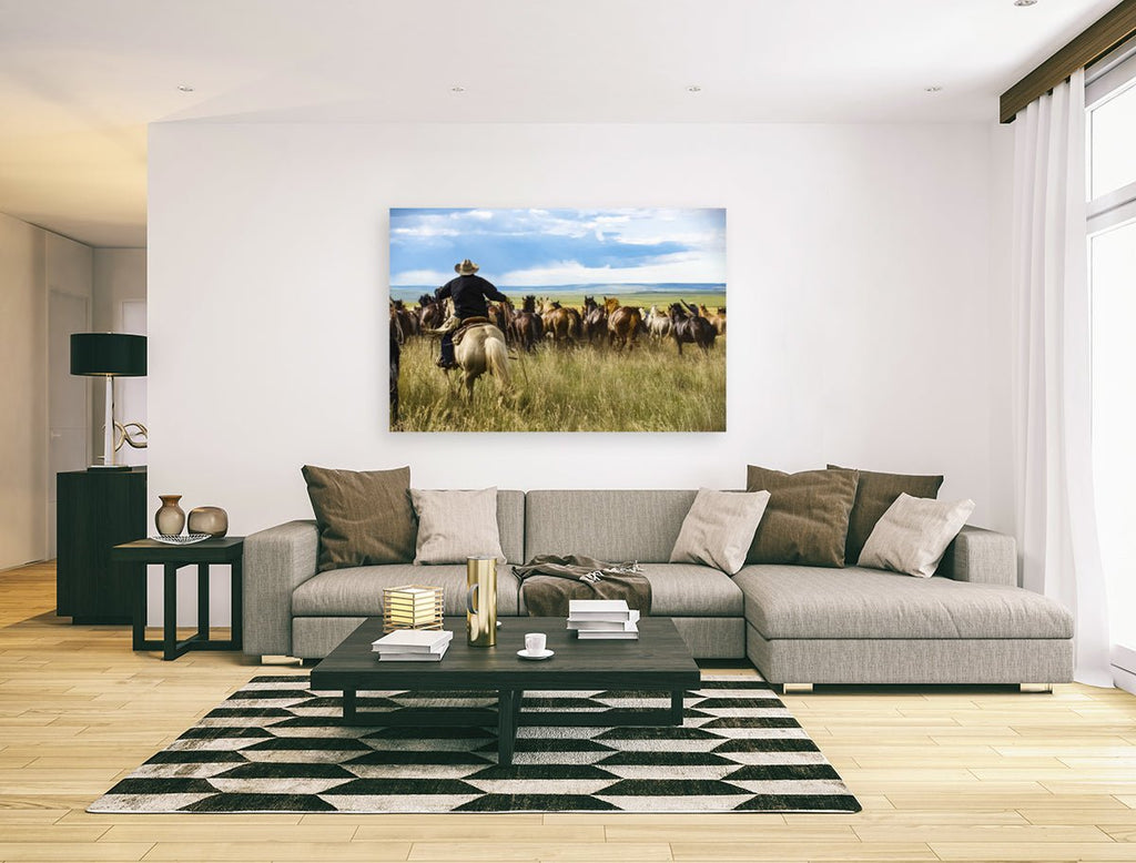 Transform your space with vintage Western art that tells a story. Michael W. Rutherford’s “Montana Wild Horse Roundup” is a rare chance to own a piece of art that preserves the rugged spirit of the Wild West. Each print brings the world of cowboys and wild horses into your home, capturing a legacy that lives on.