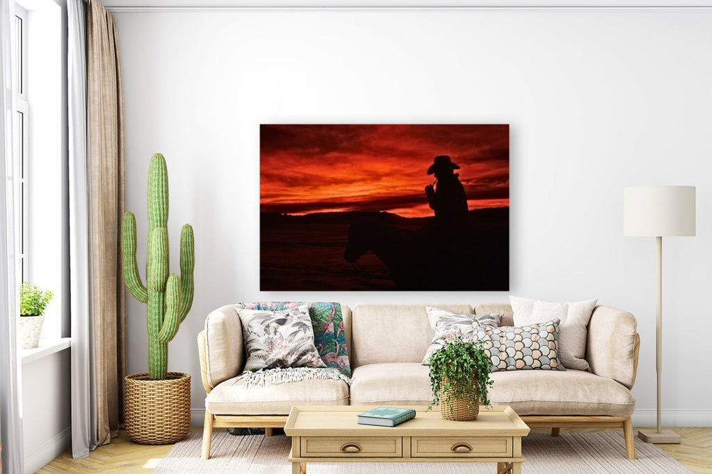 Step into the rugged, timeless beauty of the American West with this striking limited edition print by Michael W. Rutherford. Capturing a serene moment of solitude, this evocative artwork depicts a cowboy on horseback, silhouetted against a fiery red sunset. Vibrant hues of crimson and orange flood the sky, creating a dramatic backdrop that dominates the image and suggests the end of a day. The cowboy, cloaked in shadow, sits with ease on his horse, blending seamlessly into the horizon, lost in a moment of quiet contemplation.
